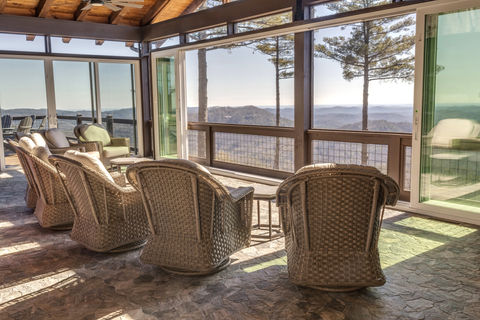 The fully enclosed 1,100+ sq. ft. outdoor veranda has a full kitchen, fireplace, tv, firepit, and wall of windows to take in the 50-mile views of 3 states and the creek that runs through the property.